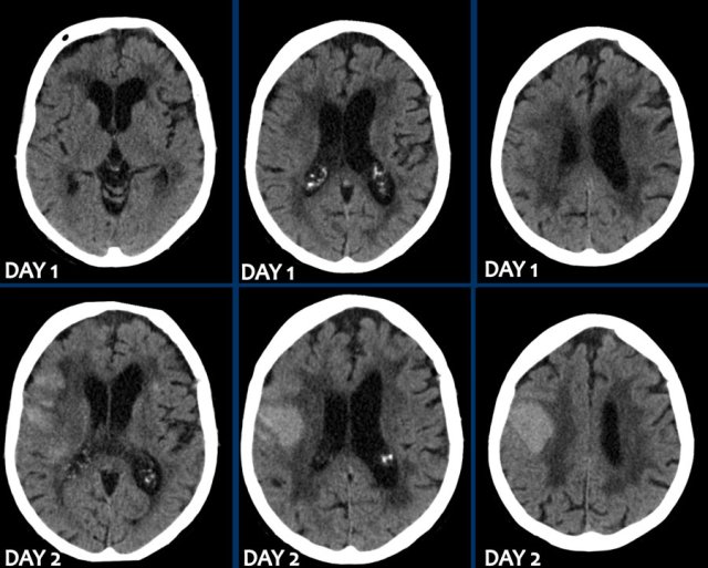 The patient underwent surgery with placement of a ventricle drain to treat the hydrocephalus.