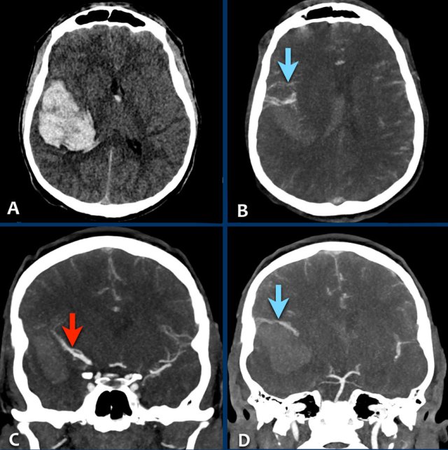 The next day the patient got worse and the second CT-scan showed a large hemorrhagic infarction in the right acm area.