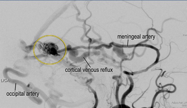 This patient was treated with embolization through the occipital artery (histroacryl) and middle meningeal artery (Squid ®) with complete obliteration of the DAVF.