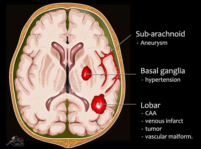- Centrally located hemorrhage in basal ganglia, pons or cerebellum. The most common cause is hypertension.