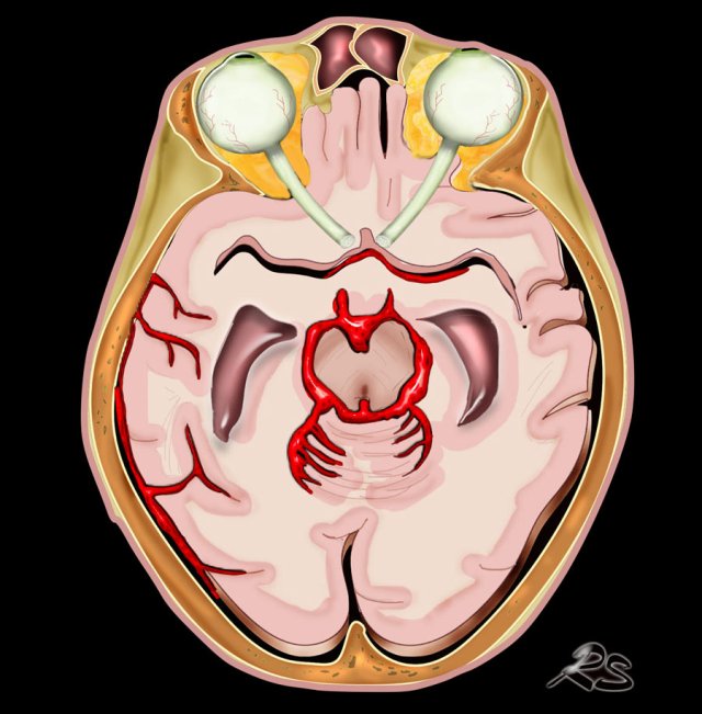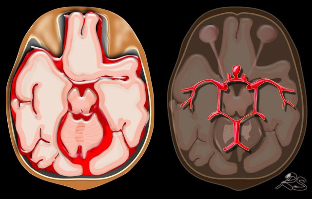Non-traumatic SAH is usually the result of aneurysmal rupture with spread of blood into the subarchnoidal cisterns (fig).