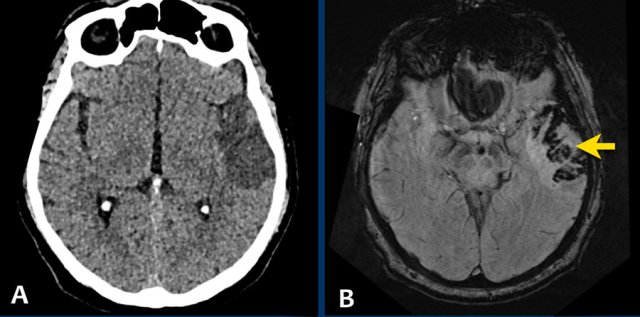 This patient had intermitted speech disturbances. MRI showed a lobar hemorrhage in the left temporal lobe.