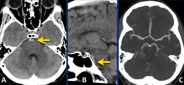 The images show a subarachnoid hemorrhage as a result of rupture of an aneurysm of the left middle cerebral artery (arrow).