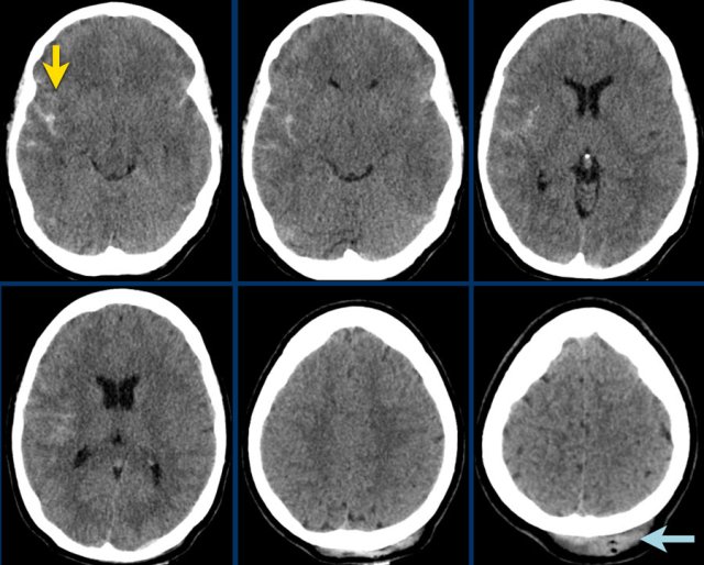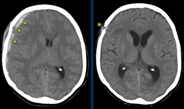 There is a subarachnoid hemorrhage on the right with a fracture of the parietal bone (yellow arrow).