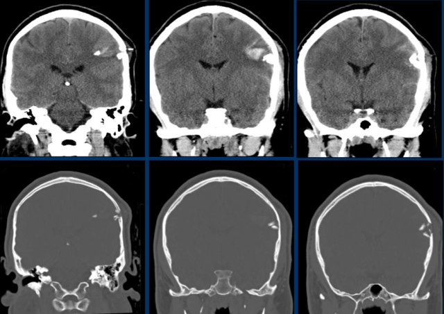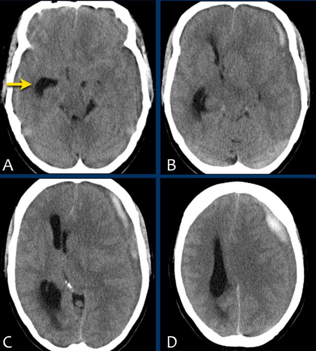 The initial CT of his head showed an acute subdural hemorrhage along the left convexity with subfalcine and uncal herniation. The hemorrhage was evacuated surgically.