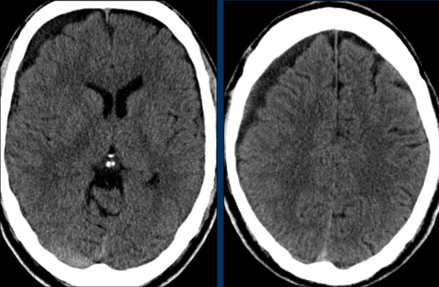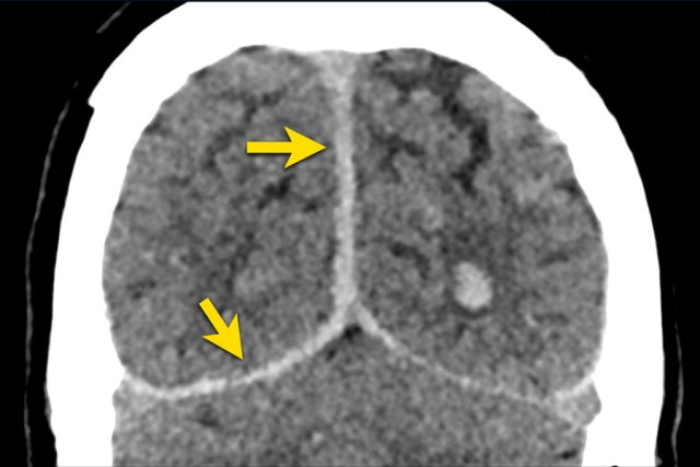 Here a case of an isodense subdural hematoma which is very hard to detect (arrows).