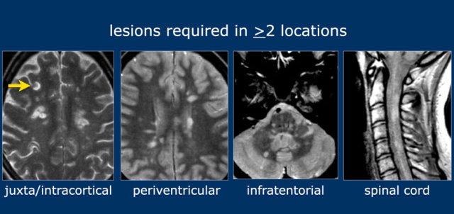 For dissemination in space (DIS) lesions in two out of four typical areas of the CNS are required: