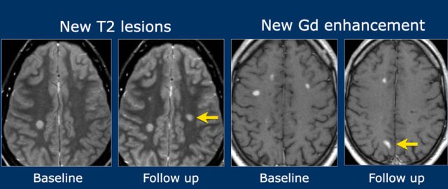 - A new T2 and/or gadolinium-enhancing lesion(s) on follow-up MRI, with reference to a baseline scan, irrespective of the timing of the baseline MRI OR