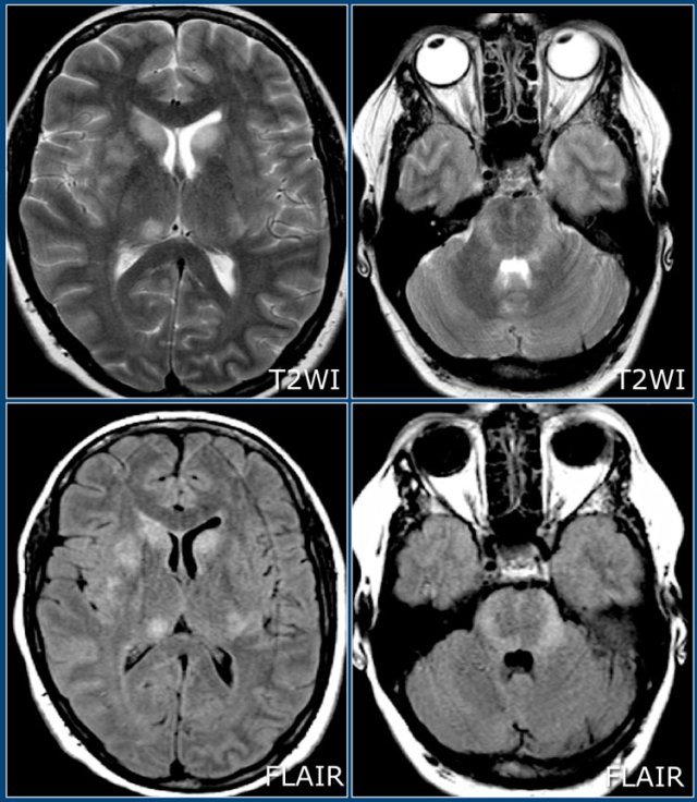 On MRI there are often diffuse and relatively symmetrical lesions in the supra-and infratentorial white matter which may enhance simultaneously.