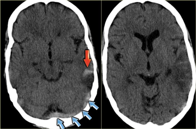 On the left images demonstrating hypodensity in the white matter and less pronounced in the gray matter of the left temporal lobe.