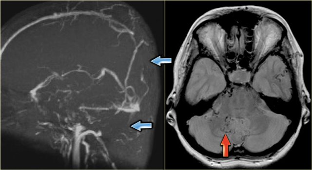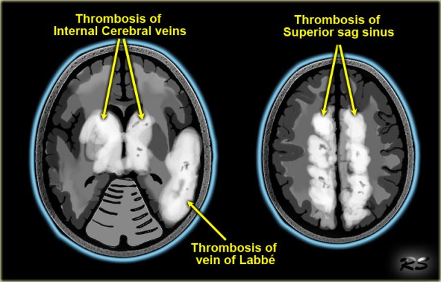 There is thrombosis of the superior sagittal sinus (red arrow), straight sinus (blue arrow) and transverse and sigmoid sinus (yellow arrow).