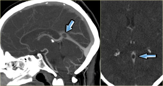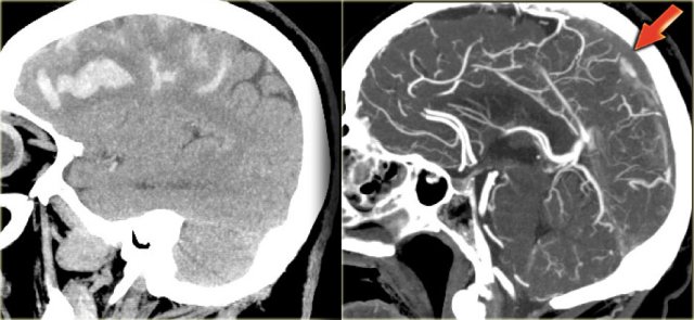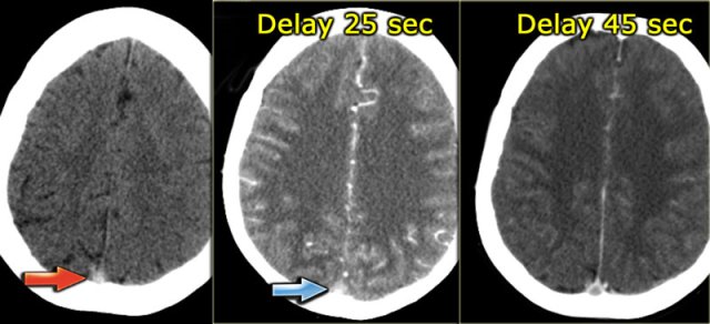 Only on the image on the right, which was made 45 seconds after contrast injection there is an empty delta sign, which proves the presence of a thrombus in the sinus.