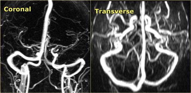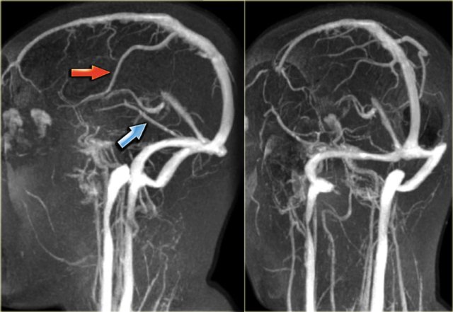 On the left an image of a thrombosed transverse sinus and next to it a normal transverse sinus.
