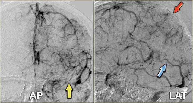Notice the direct communication between the branches of the external carotid artery and the transverse sinus (blue arrow).