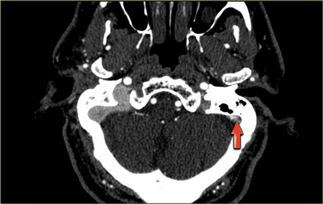 The subtle density in the area of the left transverse sinus (arrow) is the key to the diagnosis.