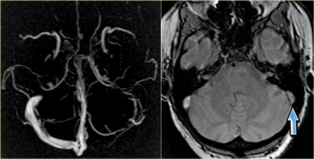 Notice the normal flow void in the left transverse sinus on the right lower image.