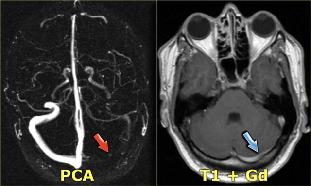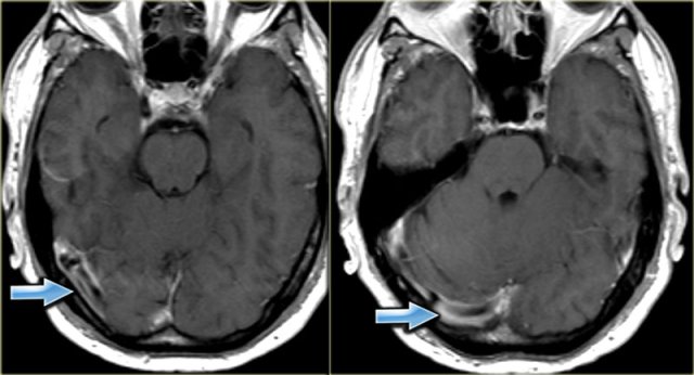 The clue to the diagnosis in this case is seen on the contrast enhanced image, which nicely demonstrates the filling defect in the sigmoid sinus (blue arrow).
