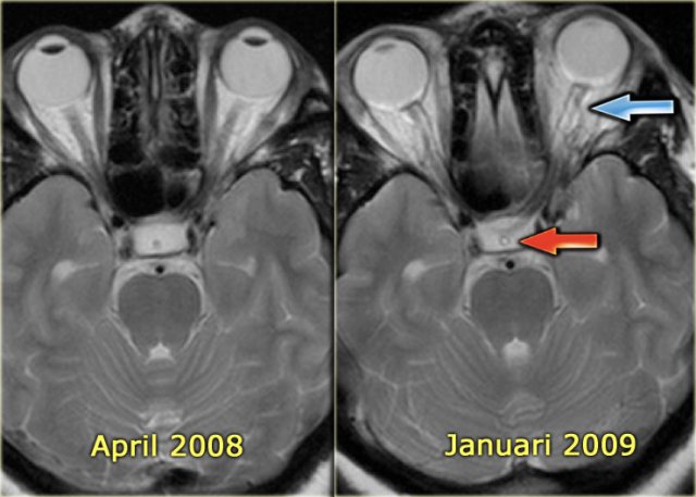 In january 2009 there are signs of intracranial hypertension like CSF surrounding the optic nerve and CSF within the stalk of the hypophysis.