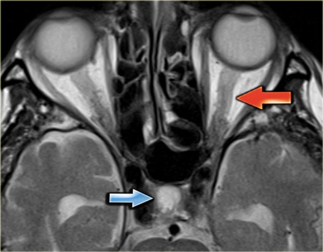 On the left a T2-weighted image demonstrating papil edema and an empty sella.