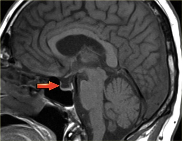 Here the sagittal T1-weighted image demonstrating the empty sella (arrow).