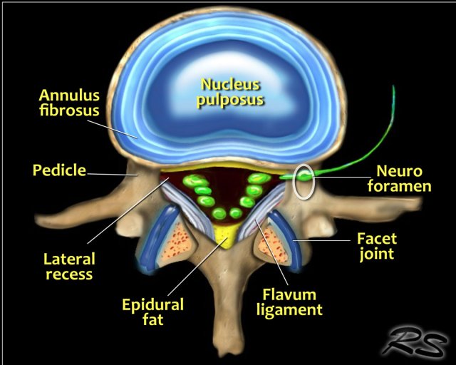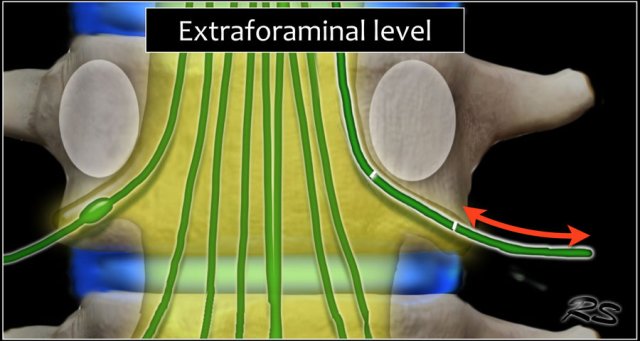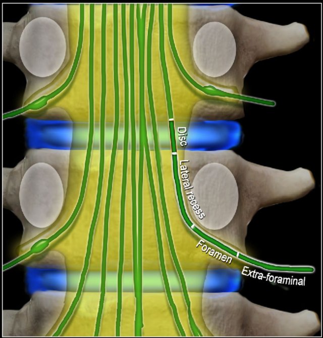 Scroll through the images to see how the nerves run at the level of the disc, lateral recess, foramen and extra-foraminal.