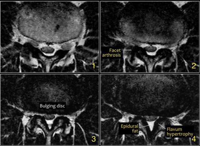 - At this level there is severe spinal canal stenosis due to bulging disc and facet arthrosis.