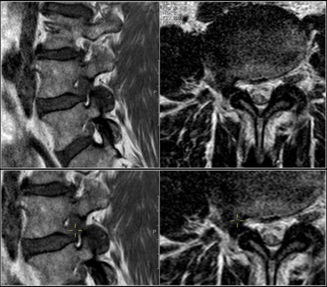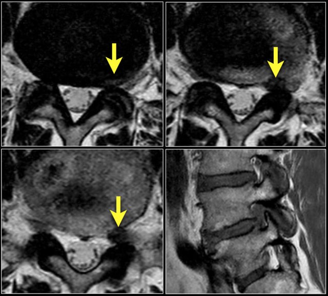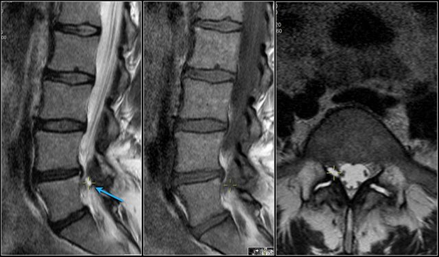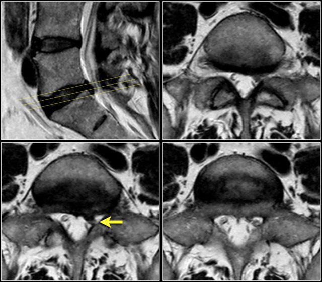 At the L5S1 level a large cyst on the right compresses the S1-nerve (yellow arrow).