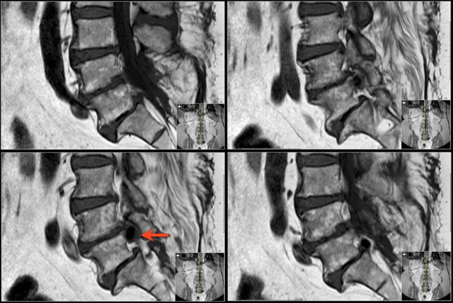 Here sagittal T1W-images demonstrating a structure of very low signal intensity at the L4L5 level (arrow) and at the L5S1 level.