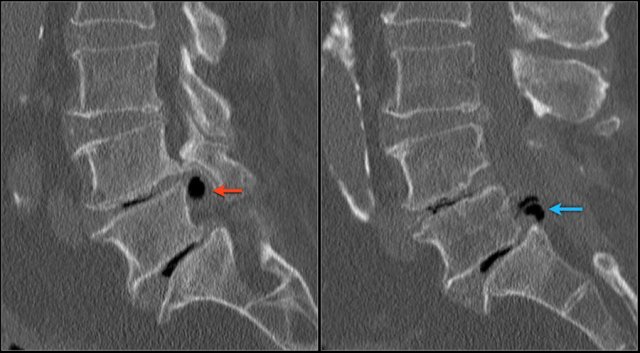 The low signal intensity could finally be explained by the vacuum phenomena due to nitrogen gas within the herniated disc both on L4L5 (red arrow) and L5S1 level (blue arrow)