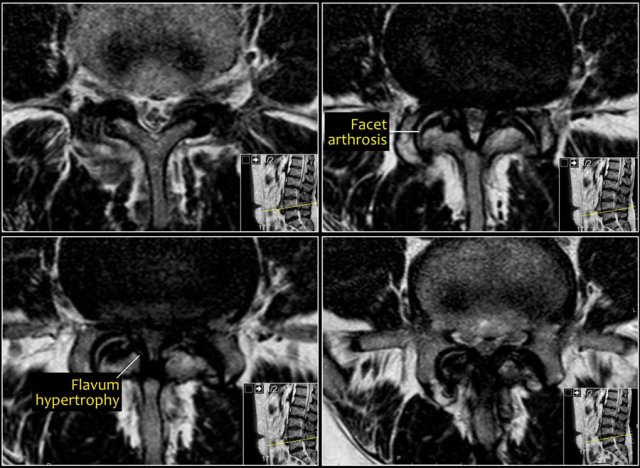 - Bilateral facet arthrosis in combination with bulging of the disc and hypertrophy of the ligamentum flavum