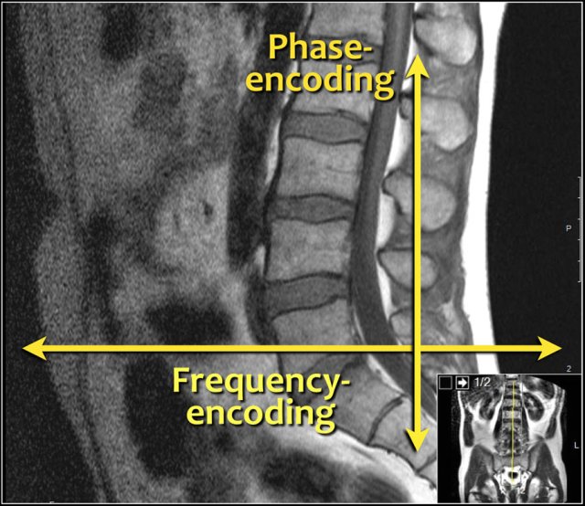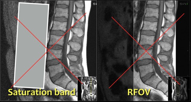 With the frequency-encoding in the AP-direction you do not have these problems and you do not need a saturation band. - Frequency encoding in the feet-head direction can result in poor deliniation of the vertebral endplates due to chemical shift artifact when the fat in the vertebral body meets the water in the disc.