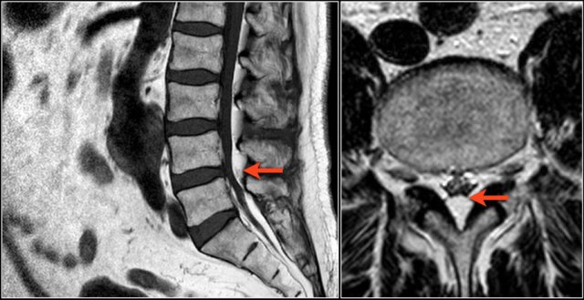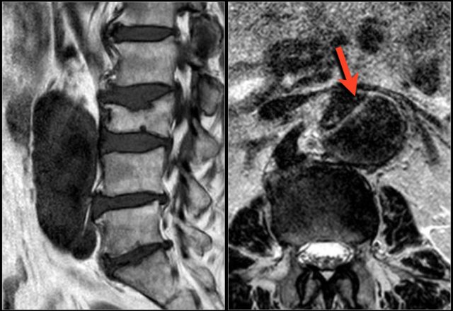 Here the L5 nerve on the right is compressed by a synovial cyst, which is the result of facet arthrosis with effusion within the intervertebral joints.