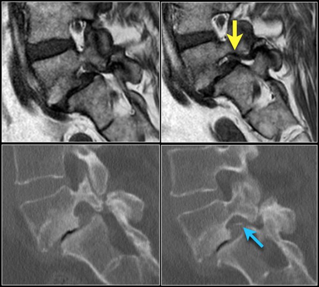 Notice the dumbbell configuration of the synovial cyst at the level of the neuroforamen (yellow arrows).