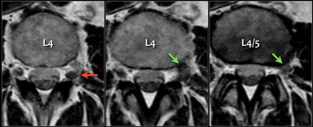 Notice the L4 nerve (red arrow), which is being displaced posteriorly by a lateral disc herniation at the L4-5 level (green arrow).