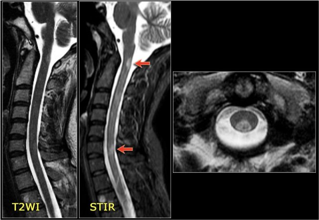 The images show a long segment myelopathy with full transverse involvement.