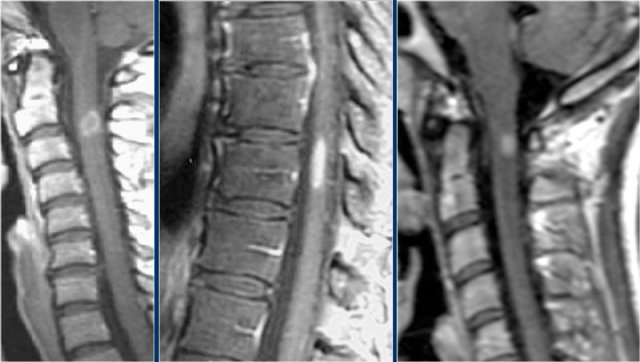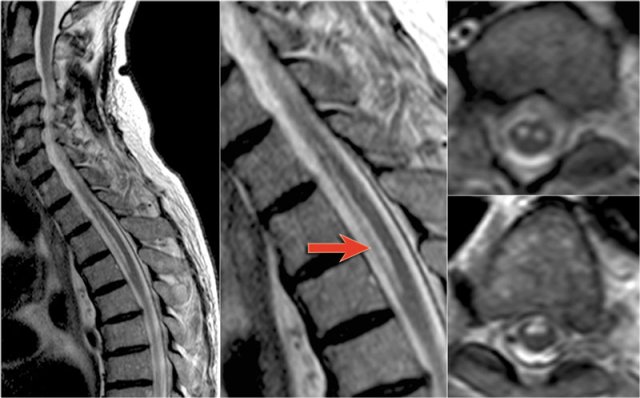 These images are of a 31 year old male with headache, voiding disturbances, urinary retention, sensory level C3.