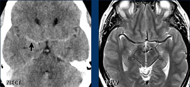 On the MRI it becomes clear, that the bilateral dense structures, that were seen on the CT, are the middle cerebral arteries.