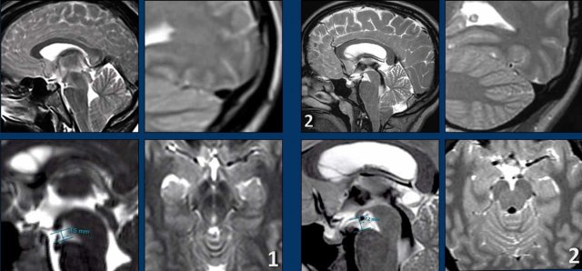 The MRI also shows midbrain sagging, seen on the axial image as as an abnormal shape and on the sagittal image as a short distance between the mamillary bodies and the pons.