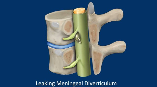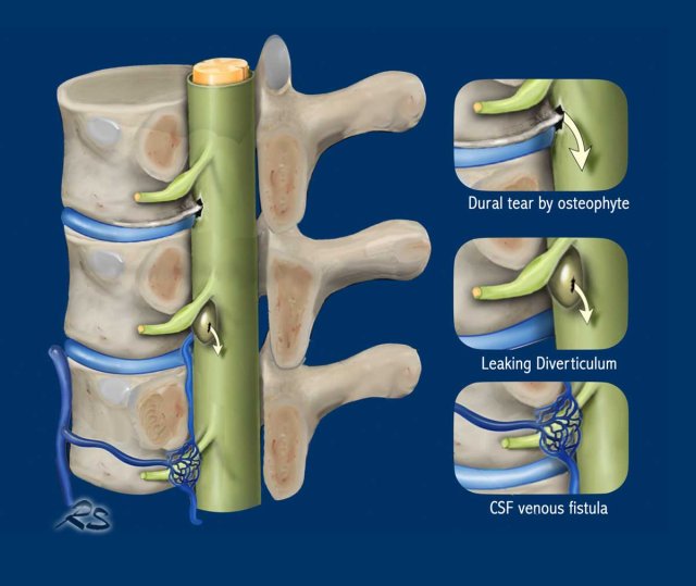 - Finding the spinal CSF leakage: Epidural collections on MRI and with Subtraction myelography and CT finding an anterior dural tear, a lateral diverticulum or a CSF-venous fistula.