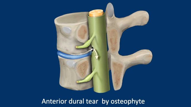 - Dural tear caused by an osteophyte.