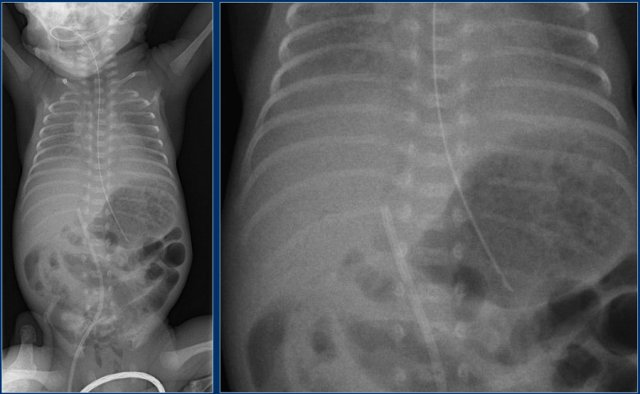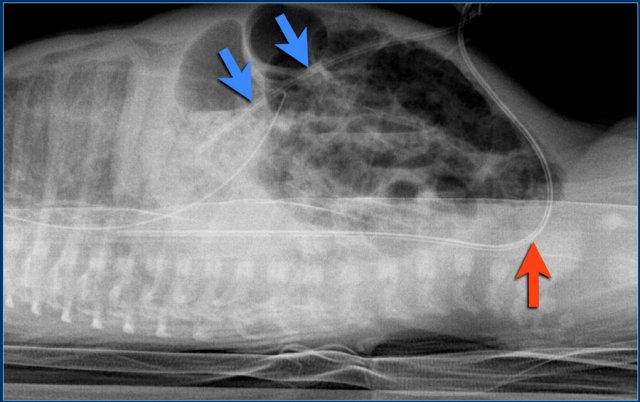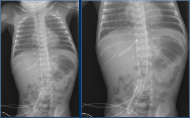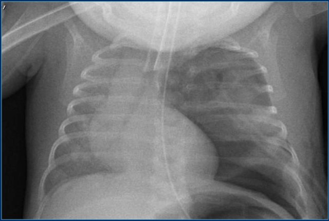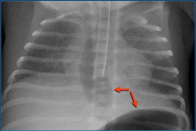 - Chest radiograph shows dilatation of the esophagus and stomach, that are filled with air (arrows).