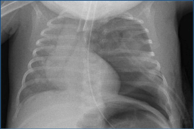 - Mediastinal shift to the right. There is however no tension-pneumothorax, since the diaphragm has a normal convex upper border.