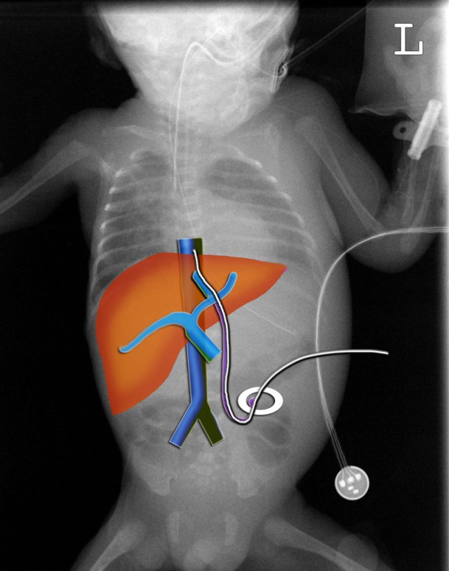 - Umbilical vein line positioned in the periphery of the liver through the right portal vein.