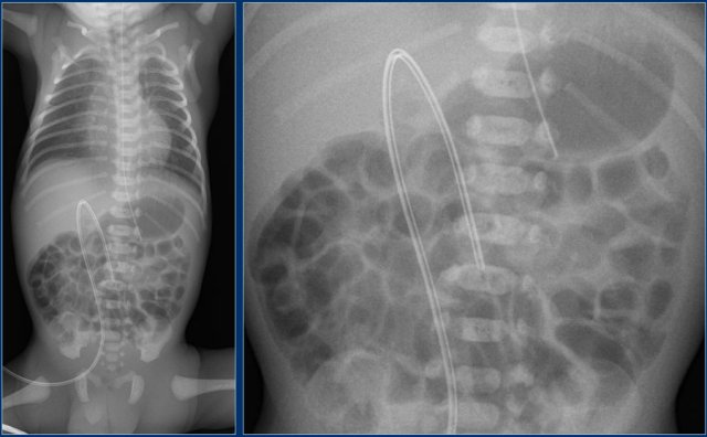 - Malposition of umbilical artery line, folded in the abdominal aorta.