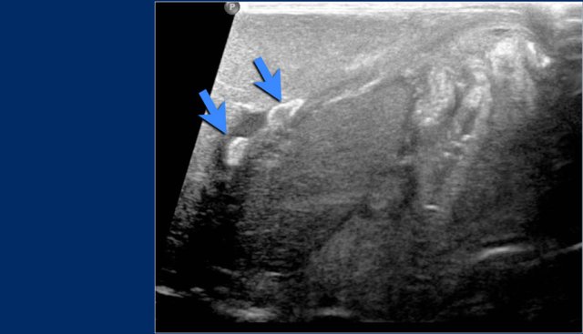 In this patient ultrasound detected a thrombus in the left portal vein after umbilical venous line (arrows).