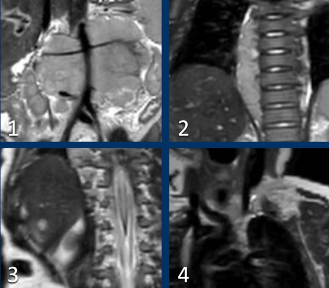 On MRI masses are seen with some enhancement after Gadolinium and remarkable strong diffusion restriction. Another tumor that can show this marked diffusion restriction is a neuroblastoma, however these tumors are often much more heterogeneous with areas of necrosis and hemorrhage