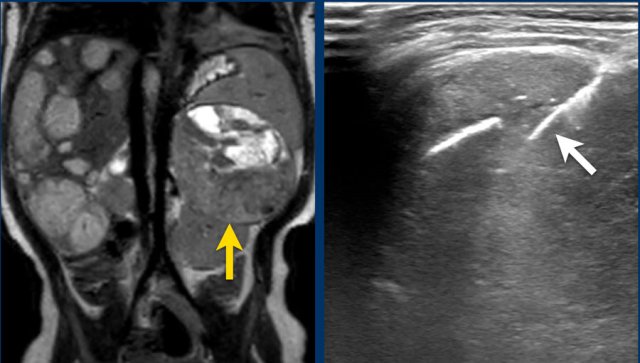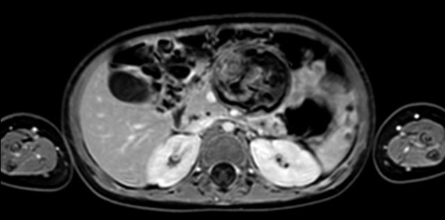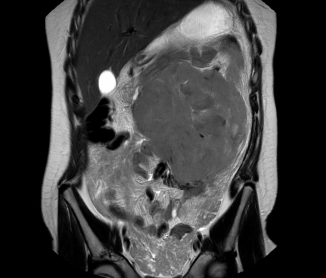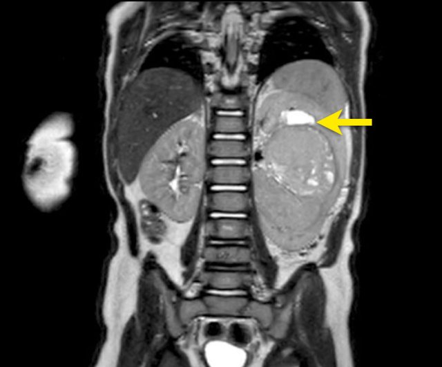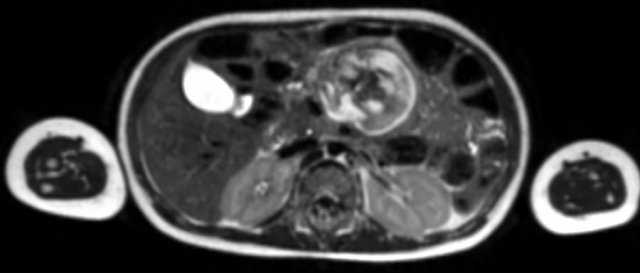 The MRI is of a nine-months-old girl with a tumor in the left abdomen. The MRI shows a tumor of the left adrenal gland, partially solid, partially cystic. Multiple liver metastases are present.