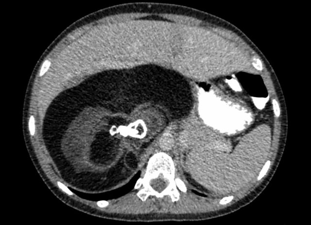 - Mass with encasement of the aorta and splanchnic vessels.