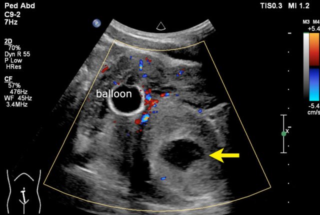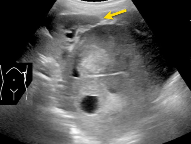A four-month-old boy with an abdominal swelling. Ultrasound shows a tumor with cystic and solid parts. Some echogenic foci are present (arrow).