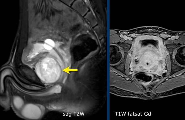 A sagittal image shows a tumor anterior to the bladder neck.